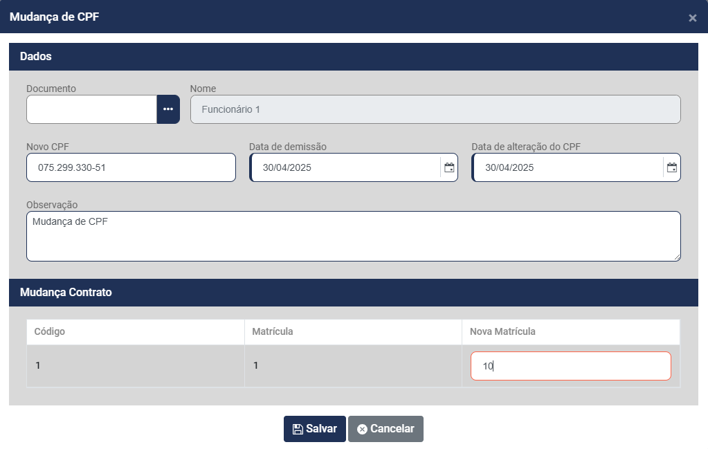 Quando o trabalhador mudar o número do CPF você deverá preencher as seguintes informações: