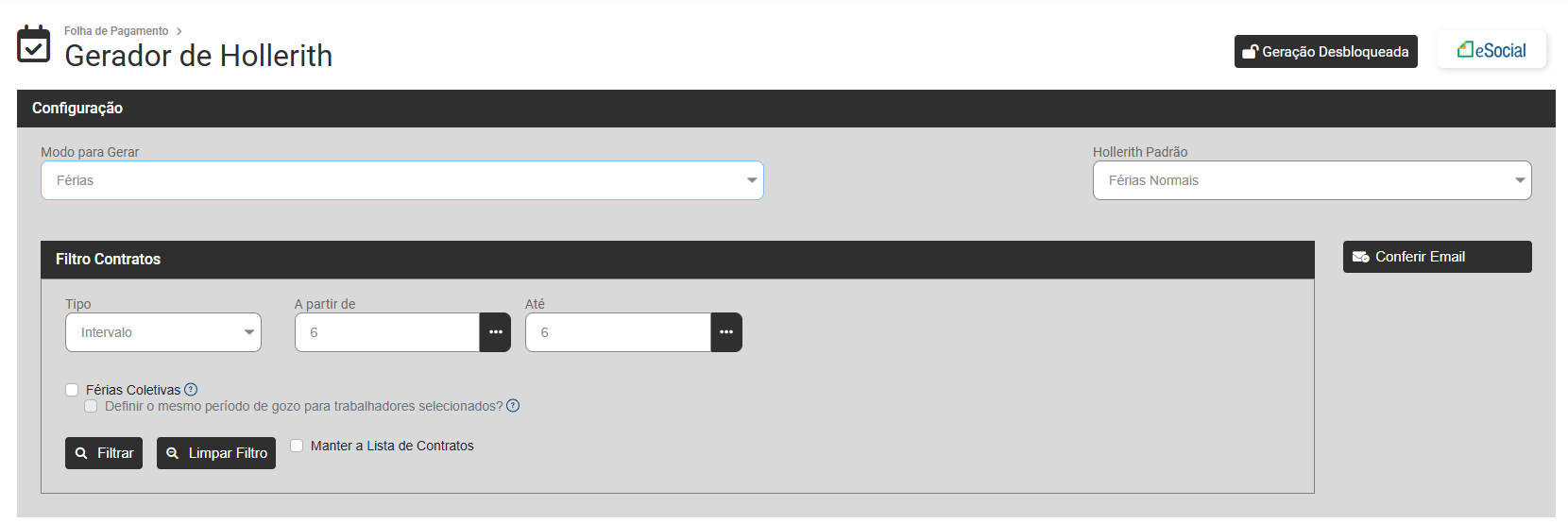 a) Utilize o botão Gerar Férias para que o Módulo acesse o menu de Geração de Holleriths