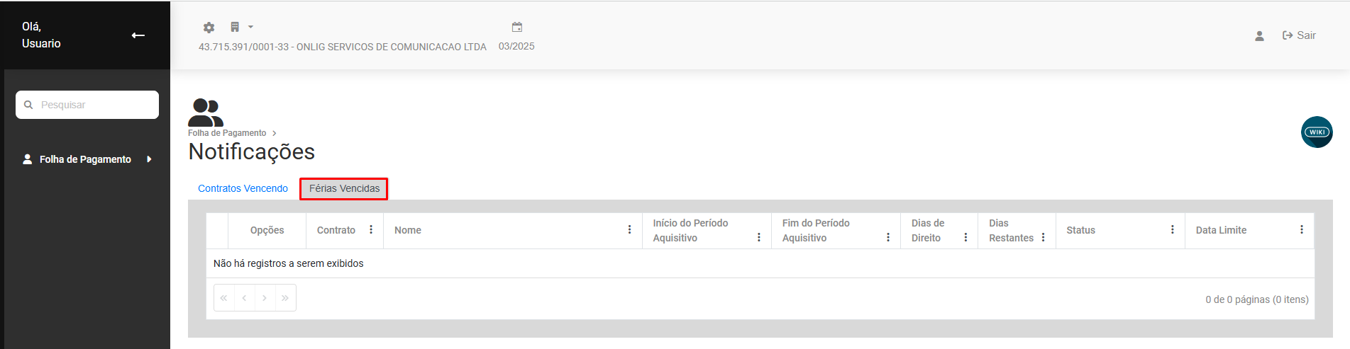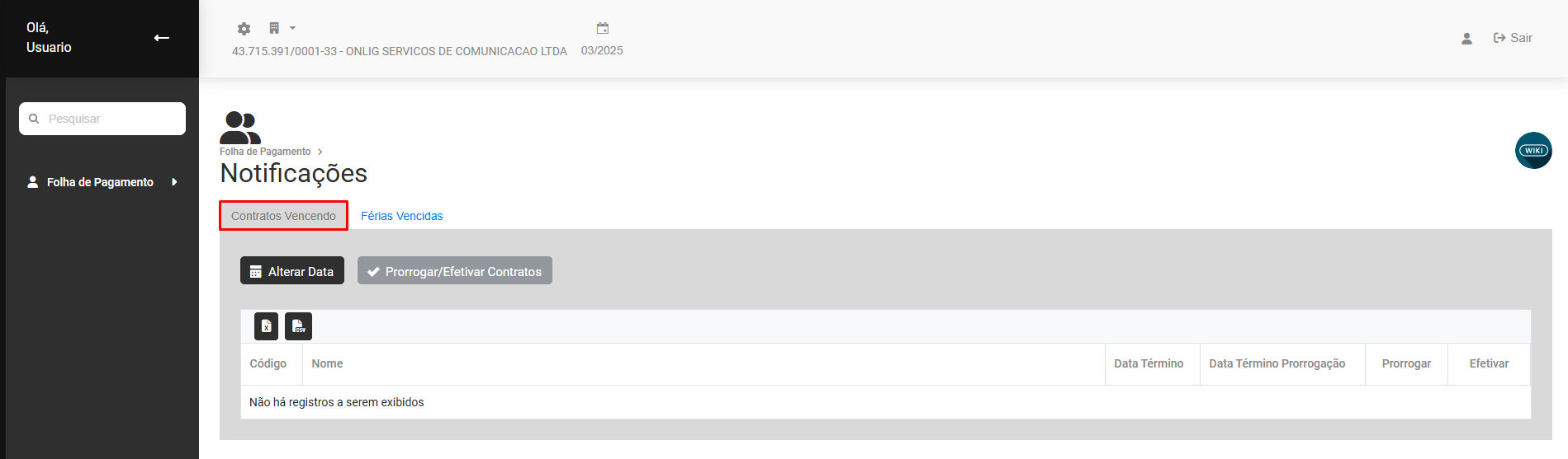 No momento em que você acessar o Módulo Folha de Pagamento, será aberta a tela com as Notificações dos Contratos Vencendo e as Férias Vencidas.