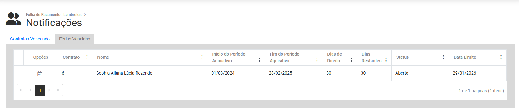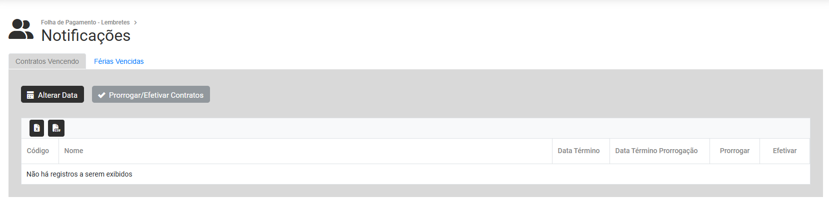 No momento em que você acessar o Módulo Folha de Pagamento, será aberta a tela com as Notificações dos Contratos Vencendo e as Férias Vencidas.