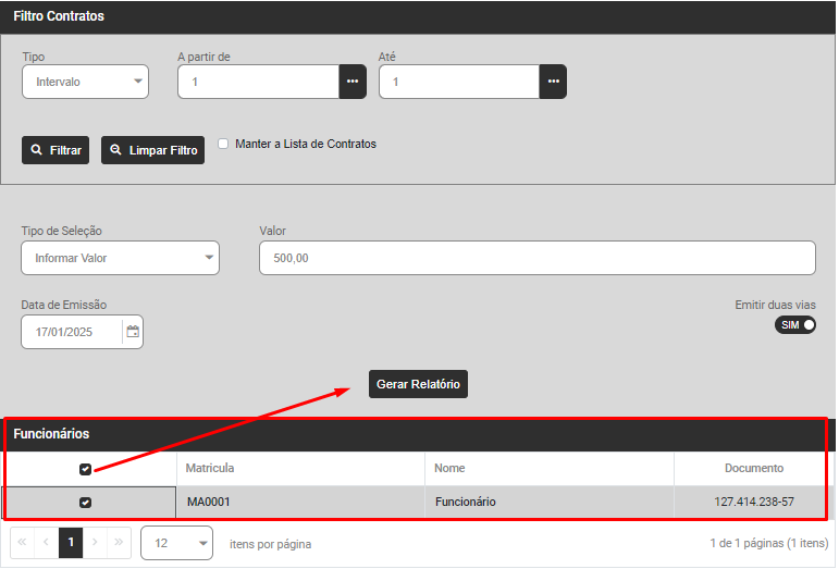 Ao definir a configuração e os trabalhadores, será apresentado na parte inferior da tela os dados dos Trabalhadores, faça a seleção do mesmo e clique em Gerar Relatório