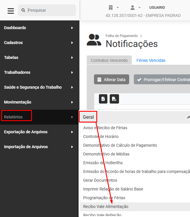 Para que você faça a impressão do Recibo de Vale Alimentação, acesse o menu Relatórios>Geral>Vale Alimentação