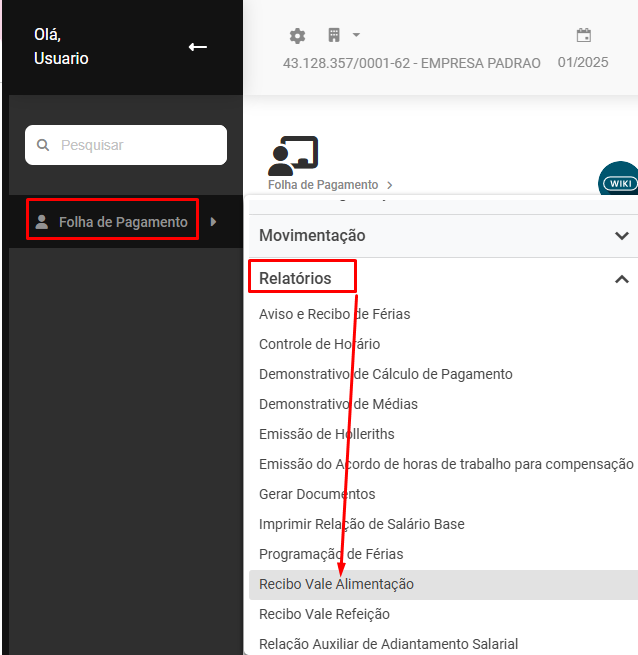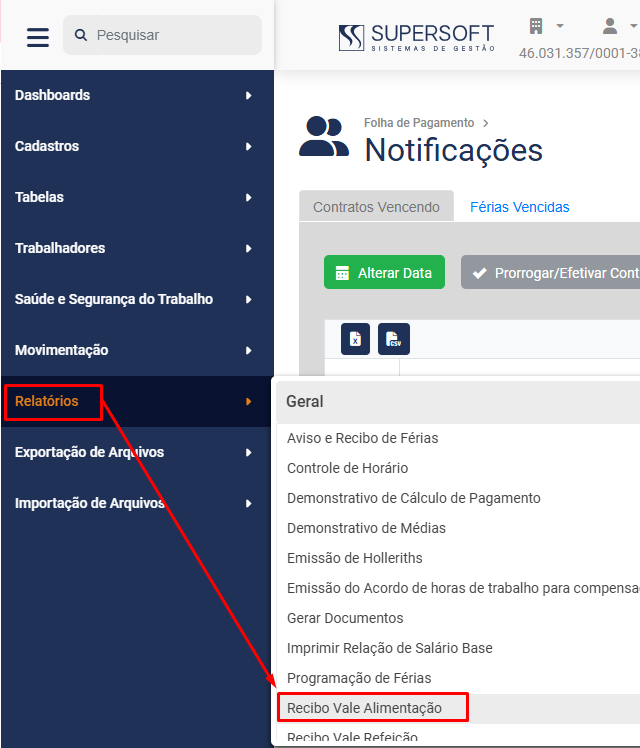 Para que você faça a impressão do Recibo de Vale Alimentação, acesse o menu Folha de Pagamento>Relatórios>Vale Alimentação