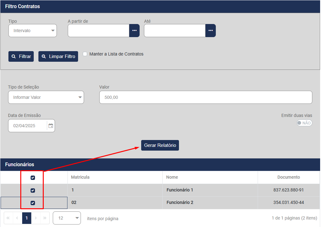 Ao definir a configuração e os trabalhadores, será apresentado na parte inferior da tela os dados dos Trabalhadores, faça a seleção do mesmo e clique em Gerar Relatório