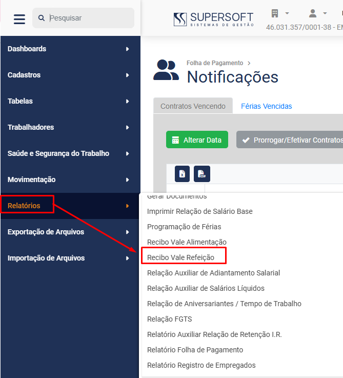 Para que você faça a impressão do Recibo de Vale Refeição acesse o menu Folha de Pagamento>Relatórios>Recibo de Vale Refeição