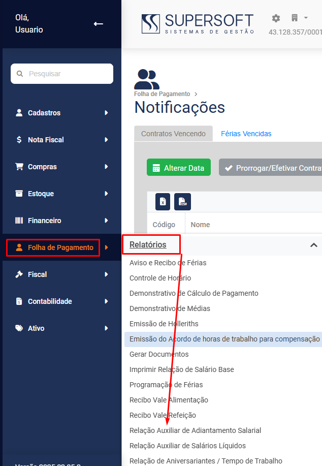 Para que você faça a impressão da Relação Auxiliar de Adiantamento Salarial, acesse o menu Folha de Pagamento>Relatórios>Relação Auxiliar de Adiantamento Salarial
