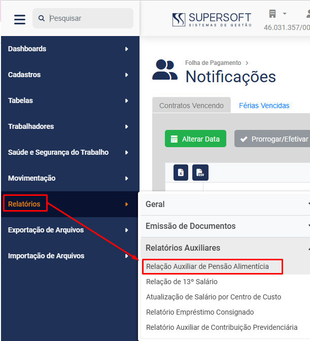 Para imprimir a Relação Auxiliar de Pensão Alimentícia acesse o menu Relatórios>Relatórios Auxiliares>Relação Auxiliar de Pensão Alimentícia
