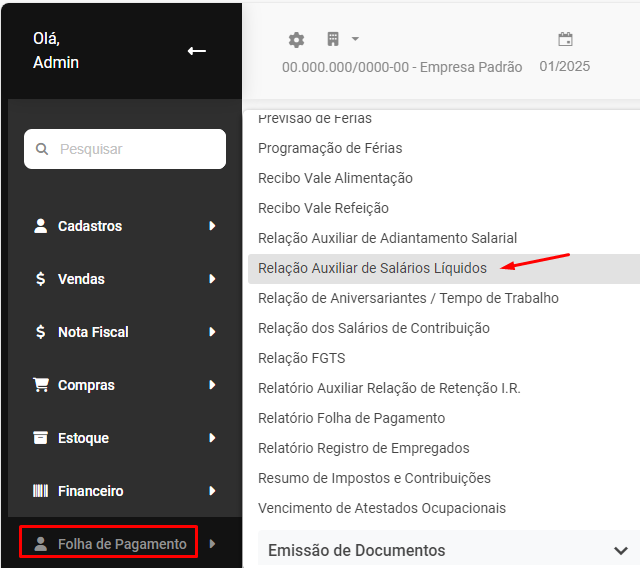 Para imprimir a Relação Auxiliar de Salários Líquidos acesse o menu Folha de Pagamento>Relatórios>Relação Auxiliar de Salários Líquidos