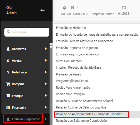 Para que você faça a impressão da Relação de Aniversariantes/Tempo de Trabalho, acesse o menu Folha de Pagamento>Relatórios>Relação de Aniversariantes/Tempo de Trabalho