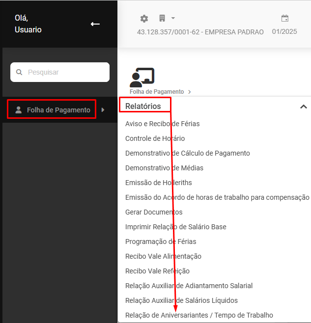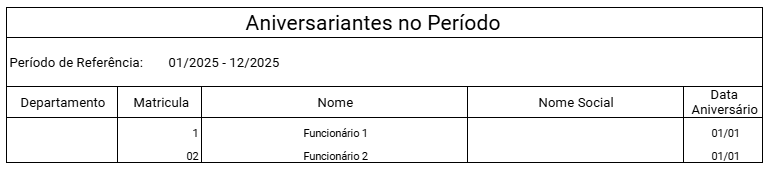 Para que você faça a impressão da Relação de Aniversariantes/Tempo de Trabalho, acesse o menu Folha de Pagamento>Relatórios>Relação de Aniversariantes/Tempo de Trabalho