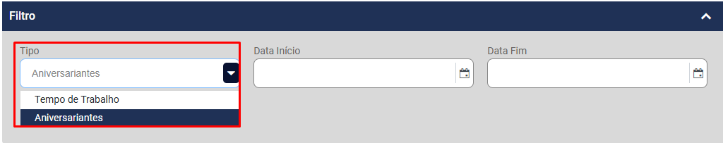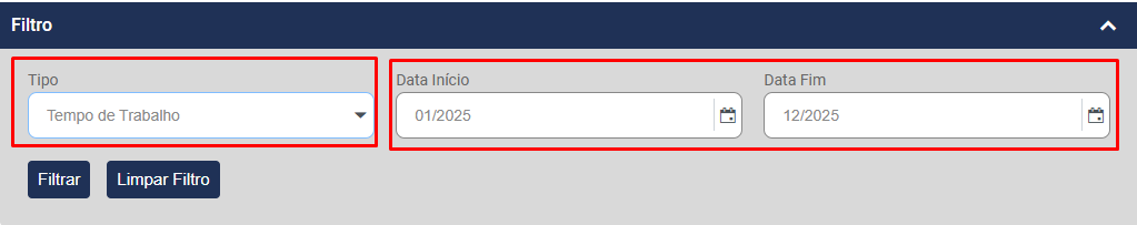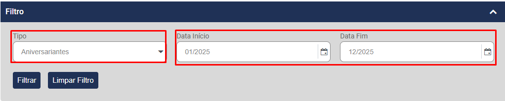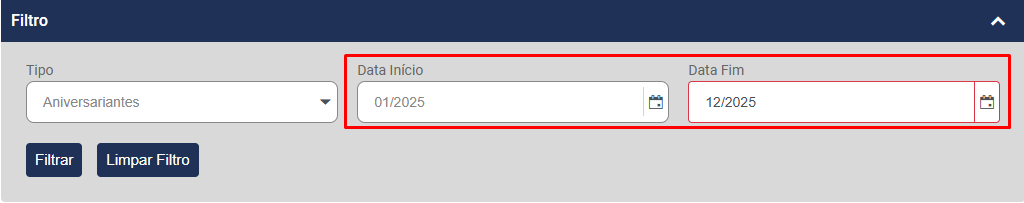 Em seguida defina a Data de Início e Data Final da Relação de acordo com o Tipo selecionado anteriormente e clique em Filtrar