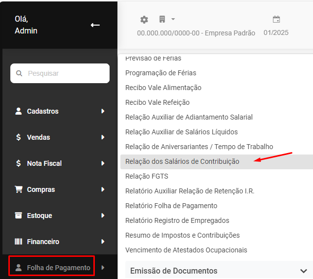Para a impressão da Relação dos Salários de Contribuição, acesse o menu Folha de Pagamento>Relatórios>Relação dos Salários de Contribuição
