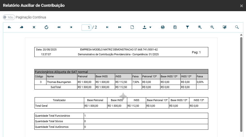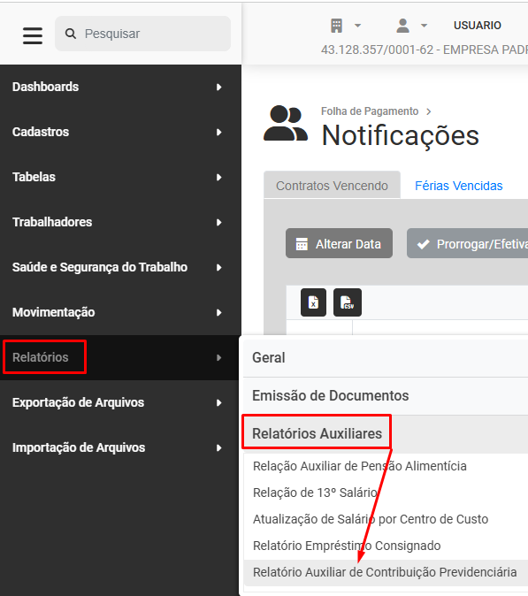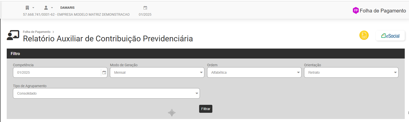 Para que você visualize ou imprima o Relatório Auxiliar de Contribuição Previdenciária deverá acessar o menu Relatório>Relatórios Auxiliares>Relatório Auxiliar de Contribuição Previdenciária