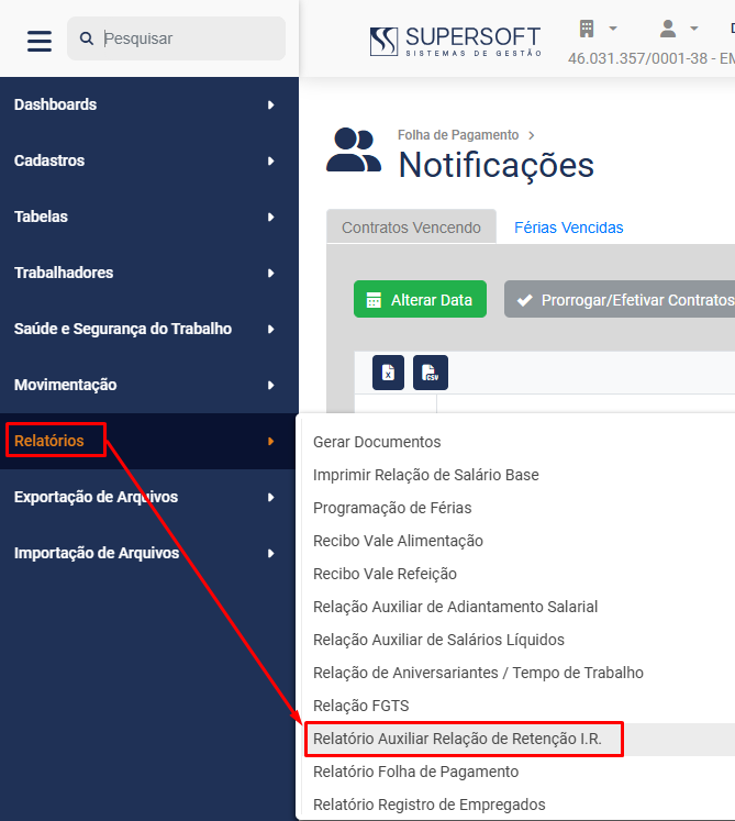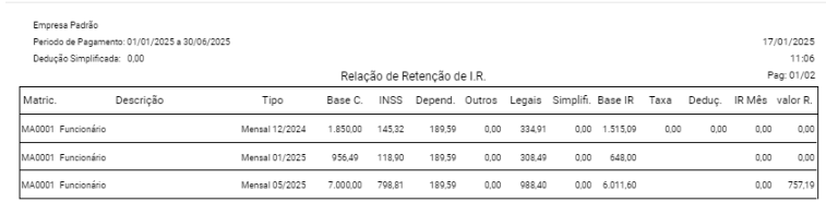 ..... Relatório Auxiliar Relação de Retenção de I.R.R.F. (IR)