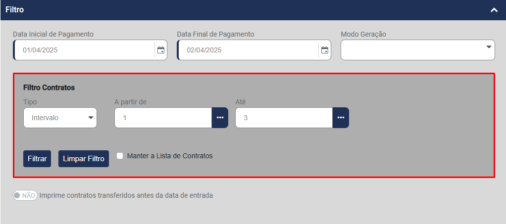 Em seguida defina o filtro de Contratos e peça para Filtrar