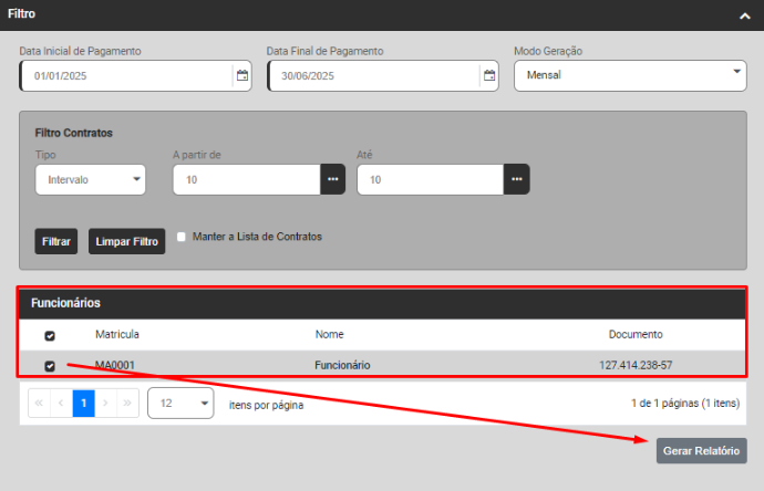 O Módulo trará os trabalhadores filtrados na parte inferior da tela, defina os trabalhadores e clique em Gerar Relatório