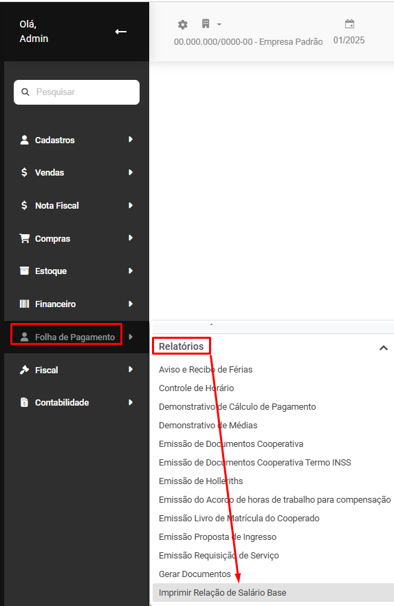 Para imprimir a Relação de Salário Base acesse o menu Folha de Pagamento>Relatórios>Imprimir Relação de Salário Base