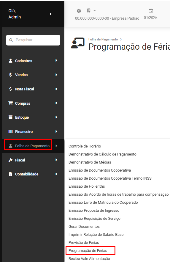 Para imprimir o Relatório de Programação de Férias, acesse o menu Folha de Pagamento>Relatórios>Programação de Férias
