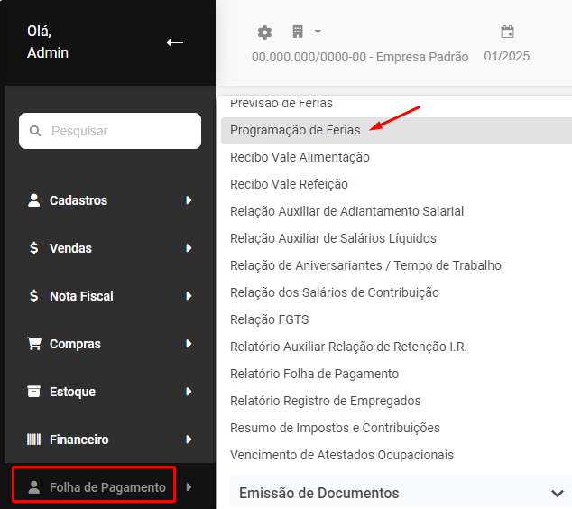 Para imprimir o Relatório de Programação de Férias, acesse o menu Folha de Pagamento>Relatórios>Programação de Férias