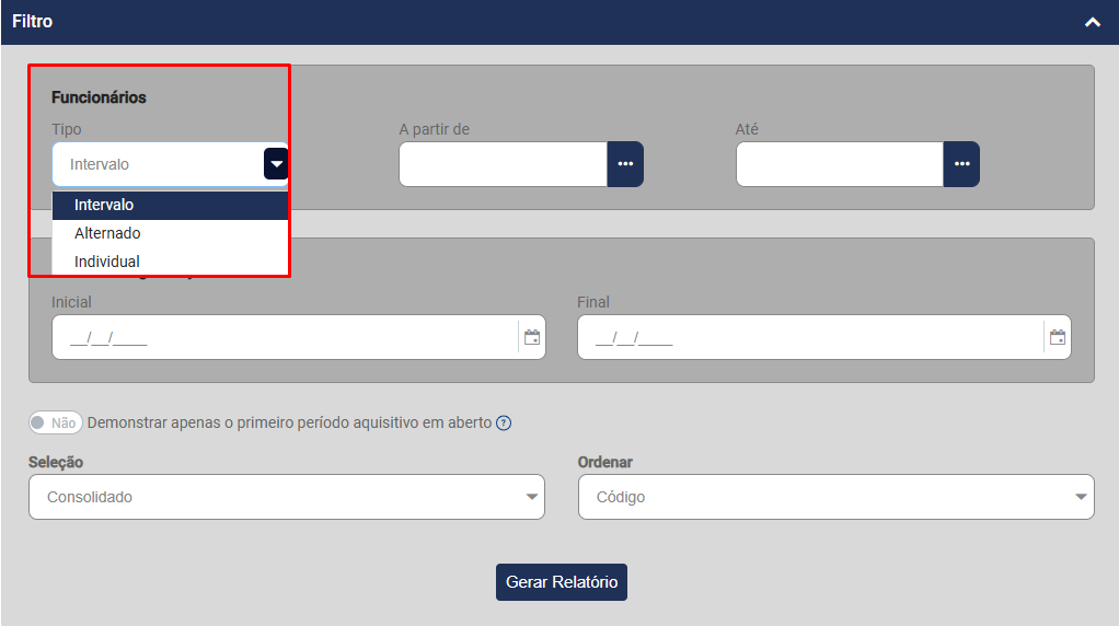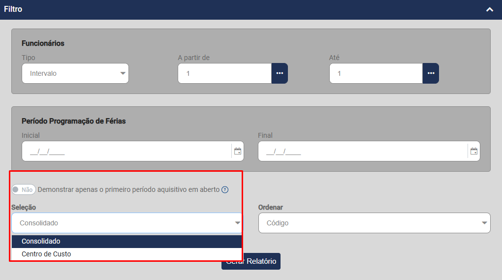 Você poderá ainda, definir que deverá ser demonstrado apenas o primeiro período aquisitivo em aberto - Apresentará apenas os períodos aquisitivos que estejam com o status 'Em aberto'.