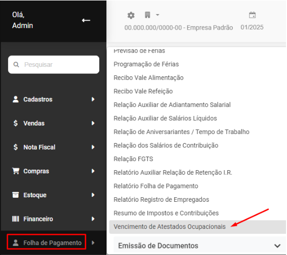 Para imprimir o Relatório de Vencimentos de Atestados Ocupacionais acesse o menu Folha de Pagamento>Relatórios>Vencimento de Atestados Ocupacionais