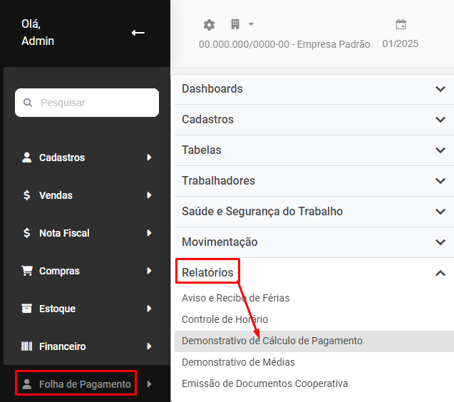 Para que você imprima o Relatório Demonstrativo de Cálculo de Pagamento deverá acessar o menu Folha de Pagamento>Relatórios>Demonstrativo de Cálculo de Pagamento