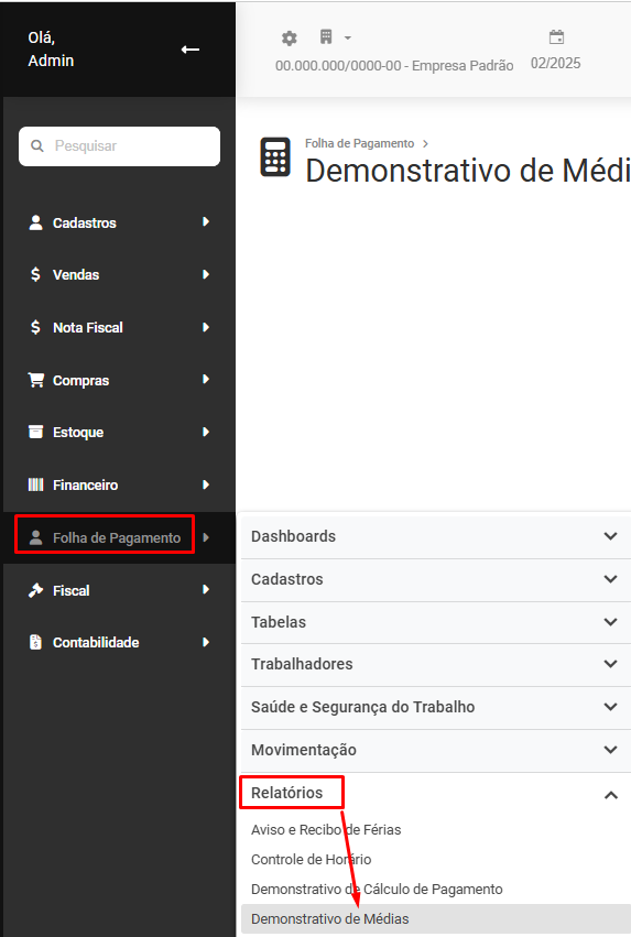 Para a impressão do Relatório Demonstrativo de Médias você deverá acessar o menu Folha de Pagamento>Relatórios>Demonstrativo de Médias