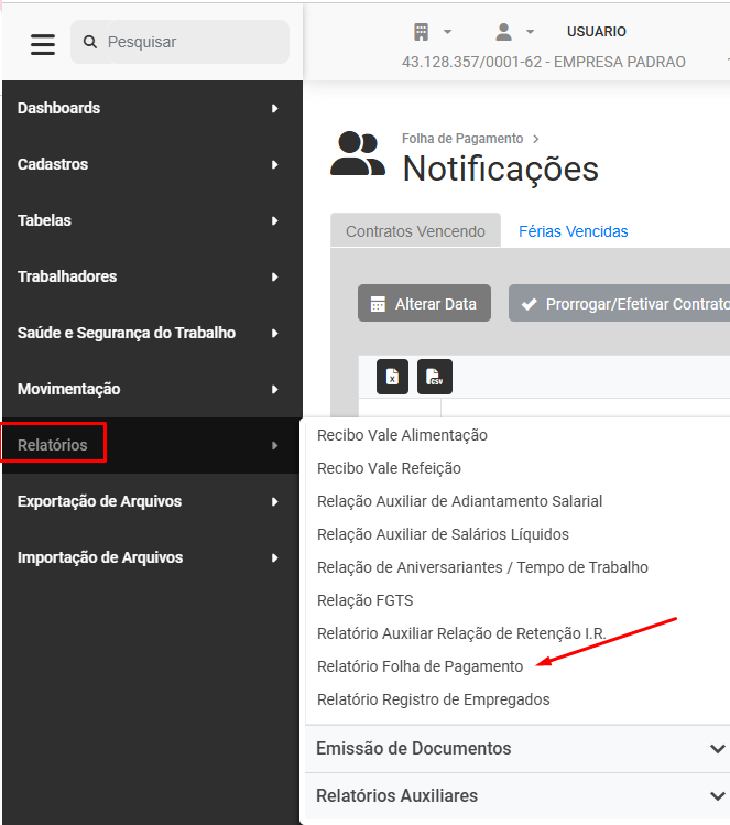 Para a impressão da Folha de Pagamento dos Trabalhadores da Empresa acesse o menu Relatórios>Geral>Relatório Folha de Pagamento