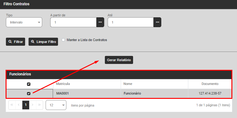 Os trabalhadores filtrados serão apresentados na parte inferior da tela, selecione os funcionários e acesse o botão Gerar Relatório