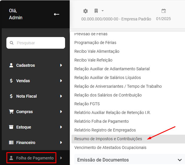 Para a impressão do Resumo de Impostos e Contribuições acesse o menu Folha de Pagamento>Relatórios>Resumo de Impostos e Contribuições
