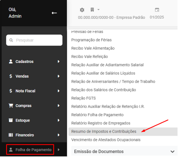 .... Resumo de Impostos e Contribuições - menu oculto