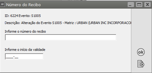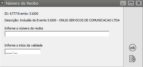 Cole na tela que será apresentada conforme abaixo o recibo copiado referente ao evento S1000, na data informe mês inicio da validade corretamente conforme o incio da obrigatoriedade de acordo com o Grupo pertencente ou a data de abertura caso tenha sido aberta após o início do eSocial.