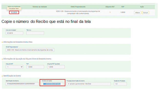 Clique na data de inicio da validade para abrir a tela que apresenta o número do recibo: