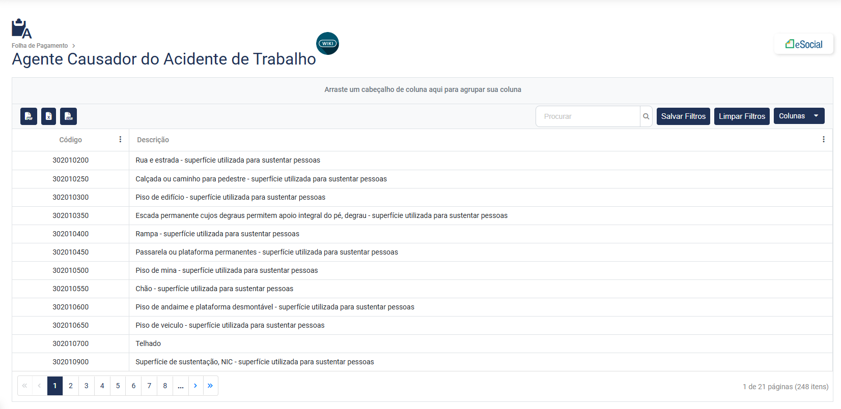 A tabela contendo os Agentes Causadores dos Acidentes já está cadastrada e pronta para utilização no Módulo, para visualizá-la acesse o menu Folha de Pagamento>Tabelas>Agente Causador do Acidente