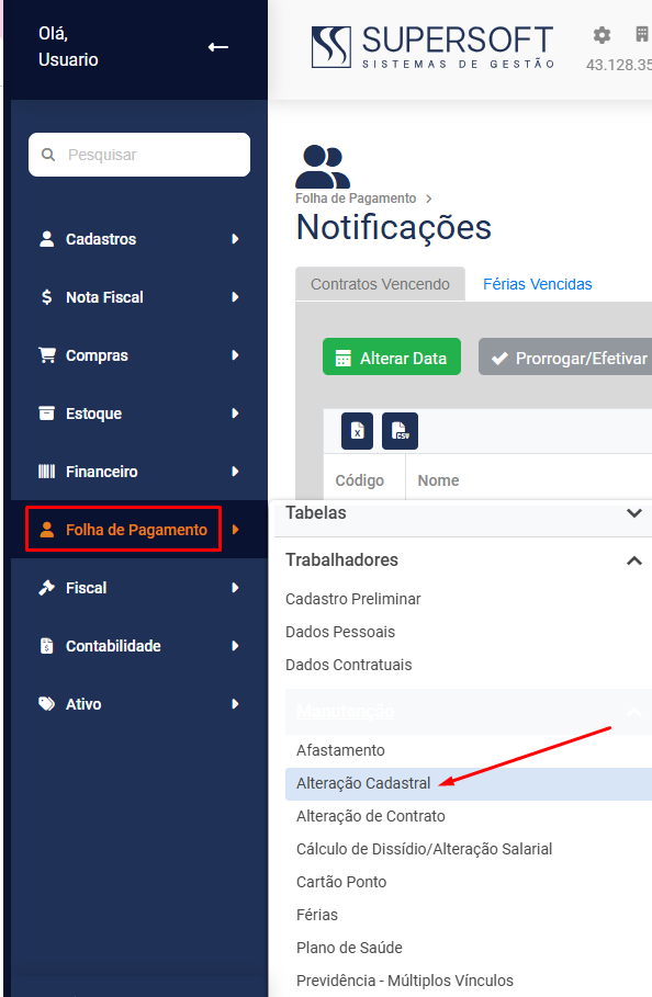 Para que você Visualize as Alterações Cadastrais deverá acessar o menu Folha de Pagamento>Trabalhadores>Manutenção>Alteração Cadastral