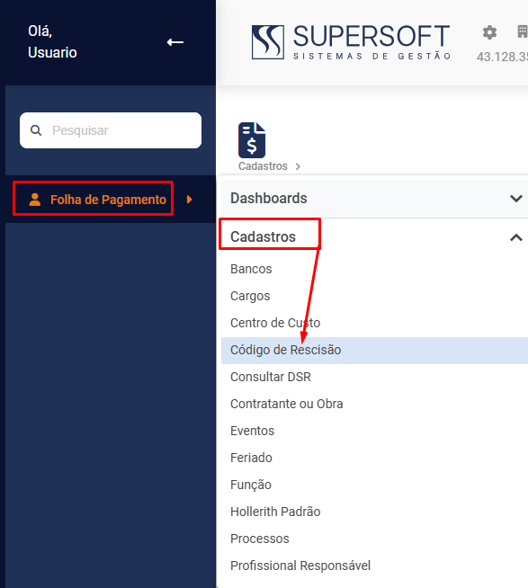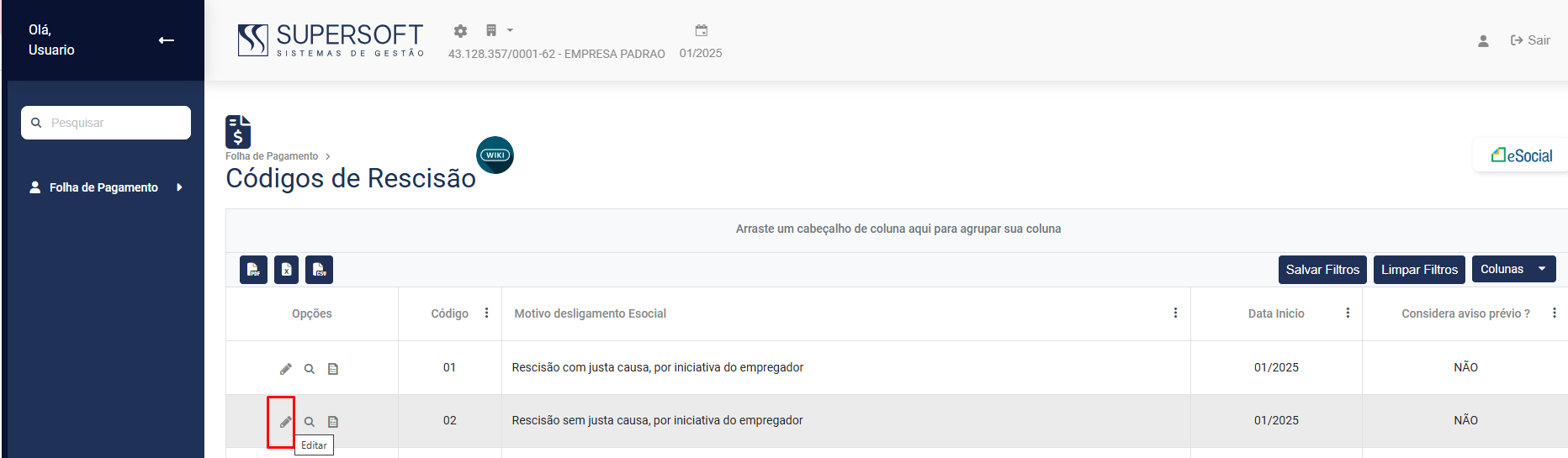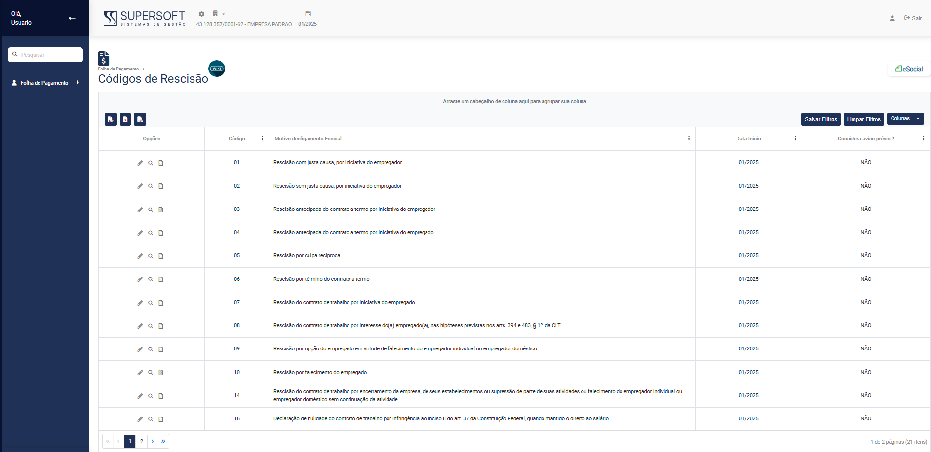 O cadastro de Códigos de Rescisão já está previamente cadastrado no Módulo da Folha de Pagamento, para visualizá-lo acesse o menu Folha de Pagamento>Cadastros>Códigos de Rescisão