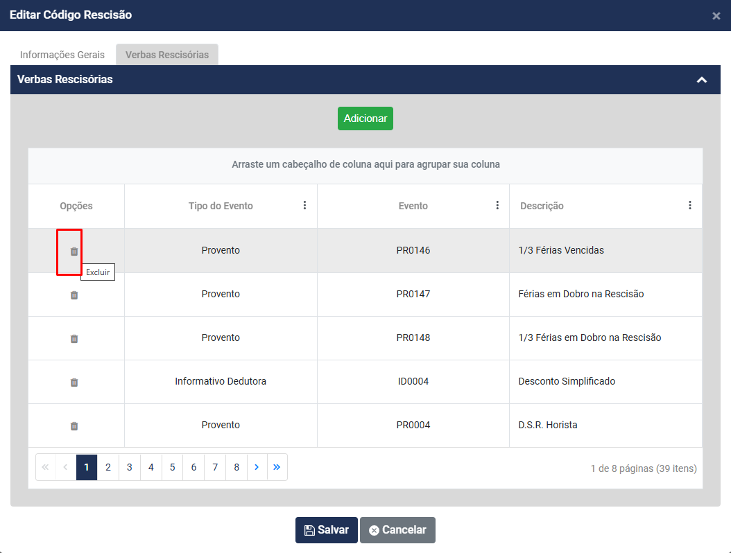 Será possível excluir verbas rescisórias da relação que está definida para os cálculo do Código de Rescisão definido anteriormente, para isso bastará que você acesse o botão "Excluir" Não será questionada a exclusão, ao clicar no botão o Módulo irá realizar a exclusão do evento.