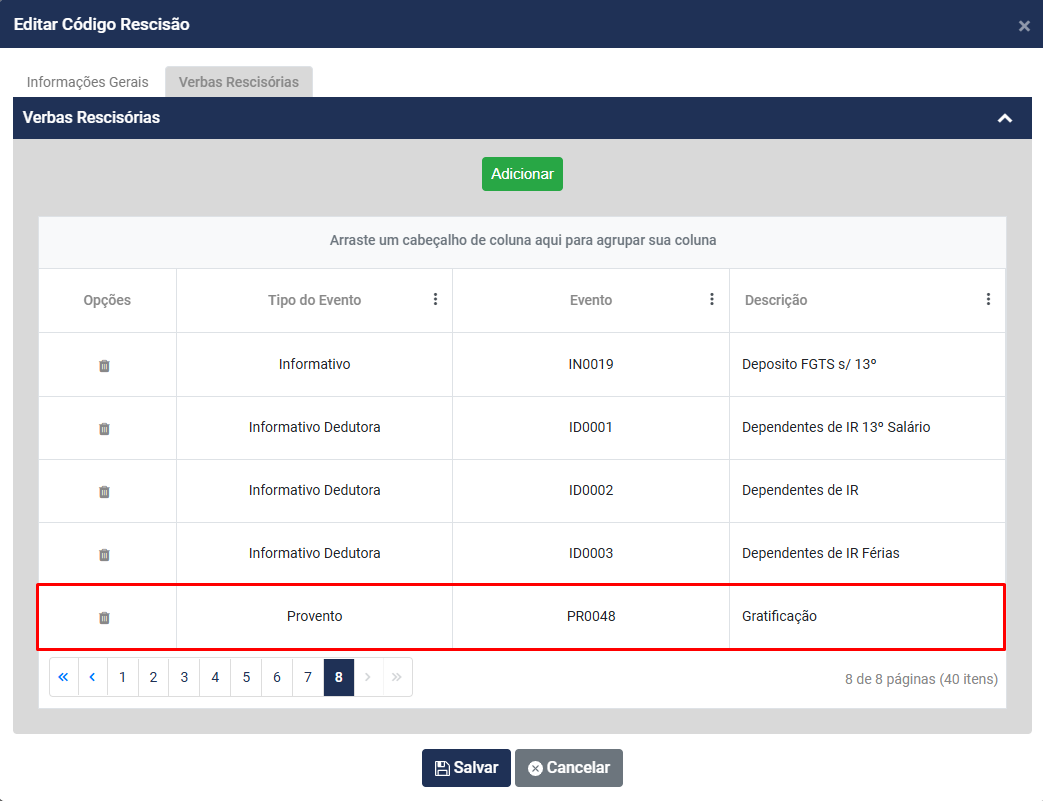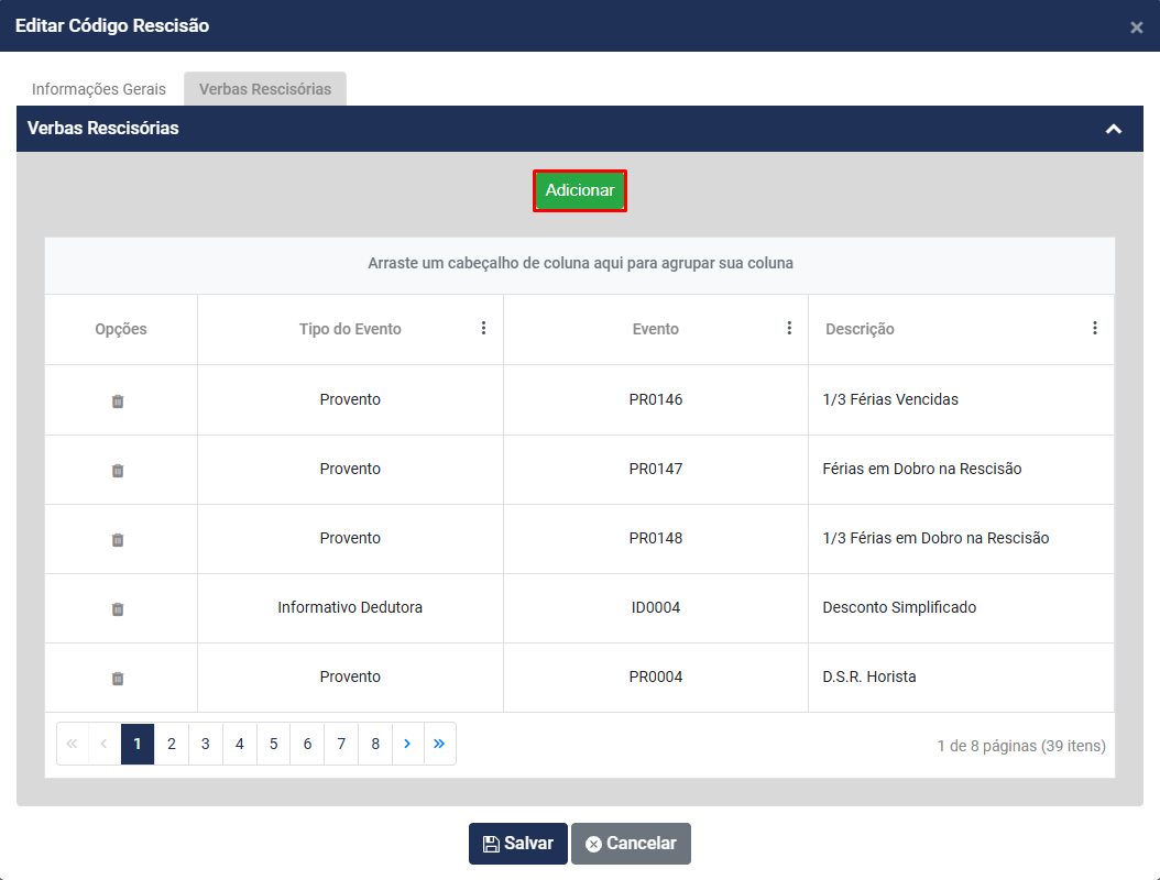 Será possível também a inclusão de novos eventos que deverão ser calculados quando esse Código de Rescisão for definido no desligamento do funcionário, para isso clique no botão Adicionar