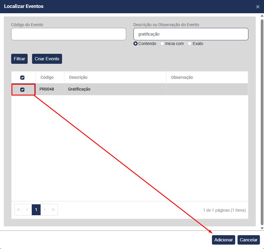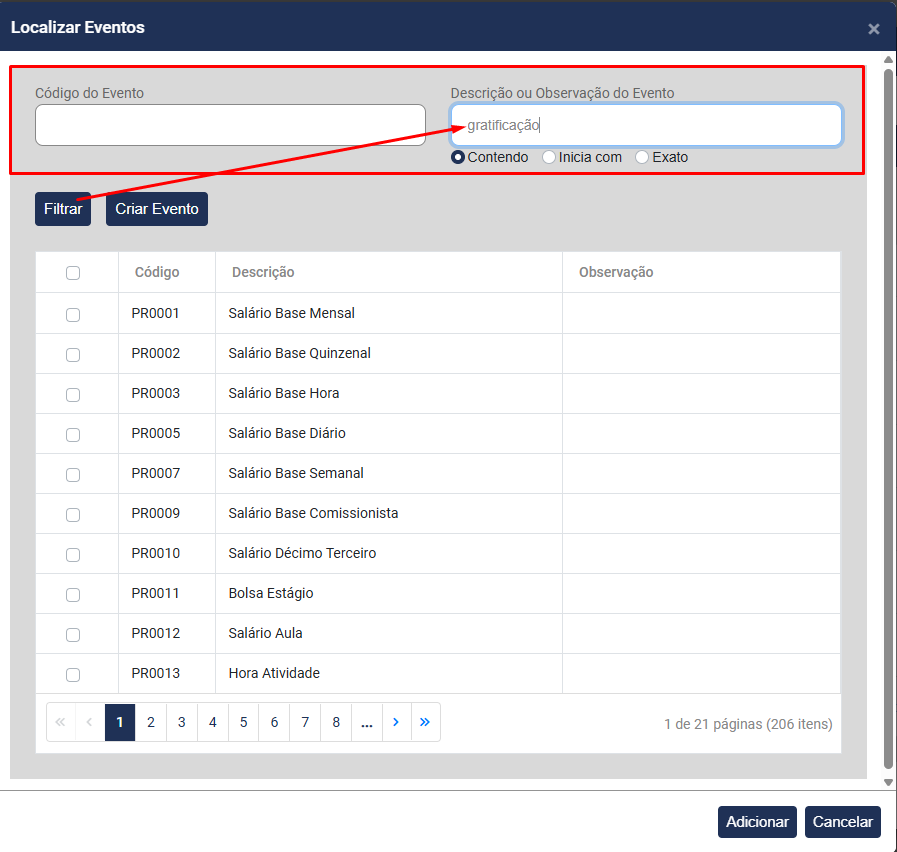 Pesquise pelo Evento, no campo Código do Evento ou campo Descrição ou Observação do Evento e clique em Filtrar
