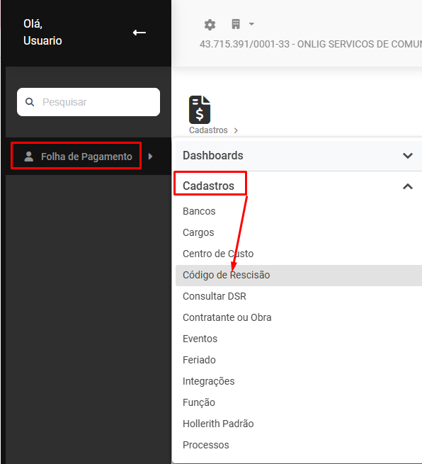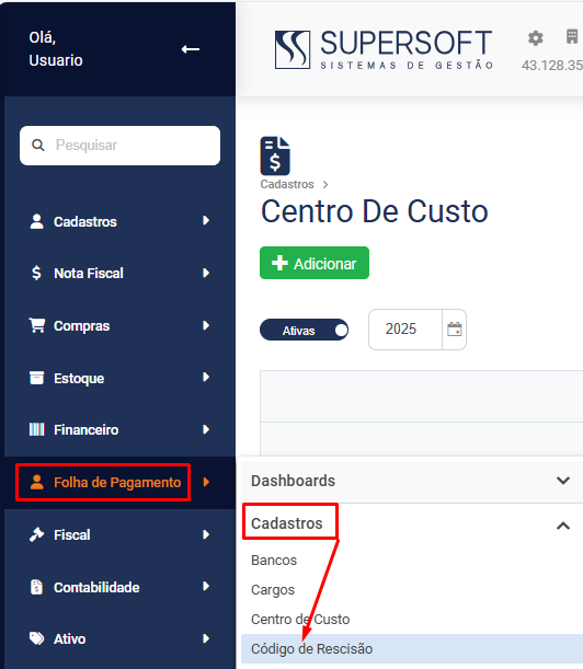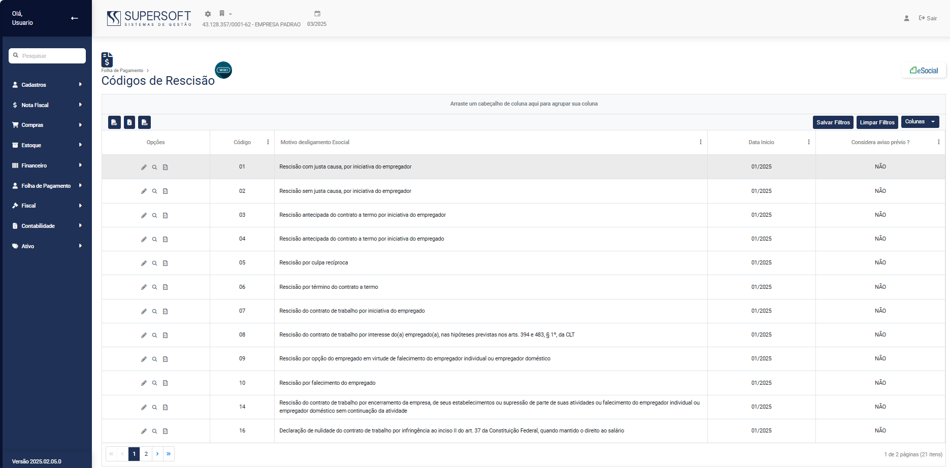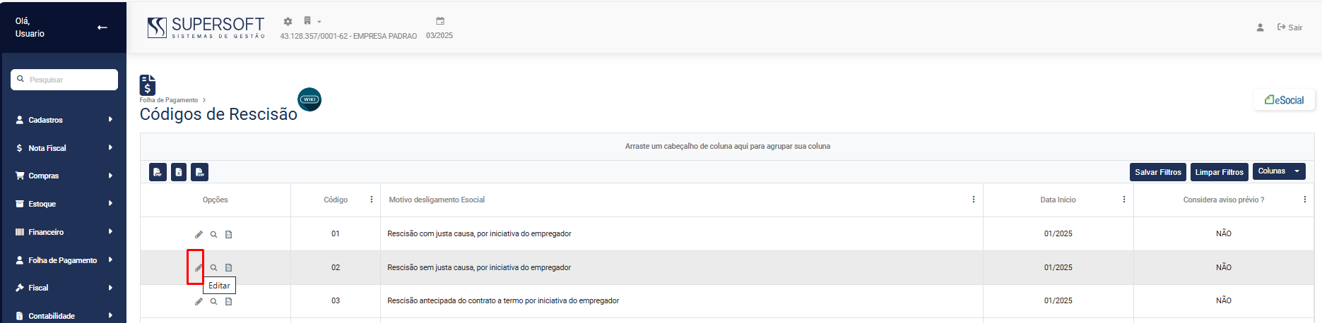 O cadastro de Códigos de Rescisão já está previamente cadastrado no Módulo da Folha de Pagamento, para visualizá-lo acesse o menu Folha de Pagamento>Cadastros>Códigos de Rescisão