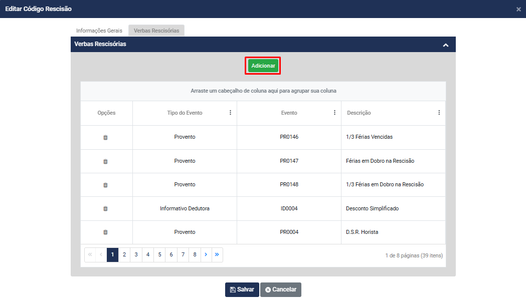 Será possível também a inclusão de novos eventos que deverão ser calculados quando esse Código de Rescisão for definido no desligamento do funcionário, para isso clique no botão Adicionar