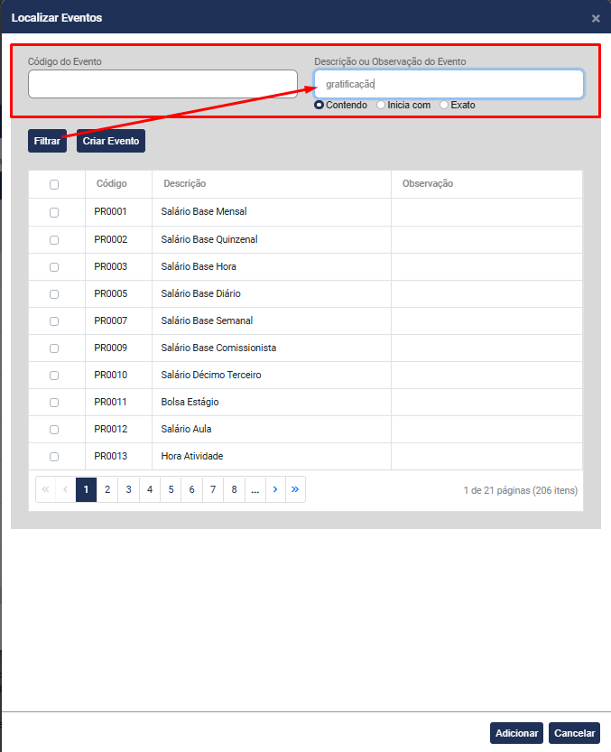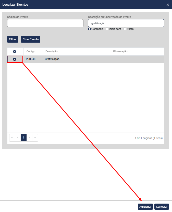 Pesquise pelo Evento, no campo Código do Evento ou campo Descrição ou Observação do Evento e clique em Filtrar