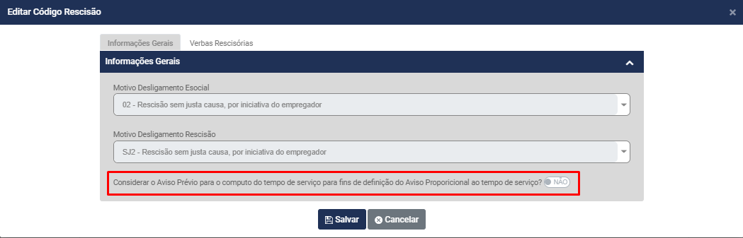 a) Informações Gerais - O único campos possível de edição será "Considerar o Aviso Prévio para o cômputo do tempo de serviço para fins de definição do Aviso Proporcional ao tempo de serviço ?