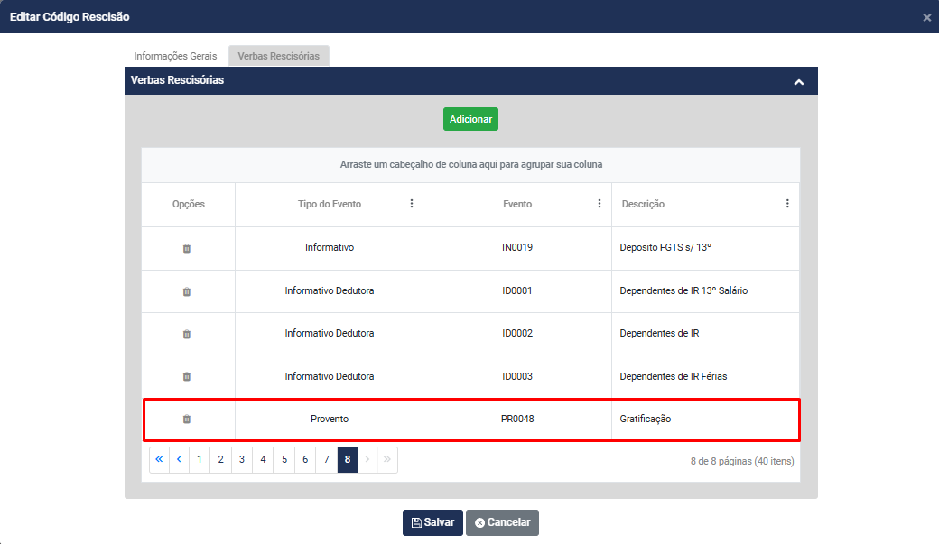 Visualização de Código de Rescisão e Inclusão e Exclusão de Verbas Rescisórias