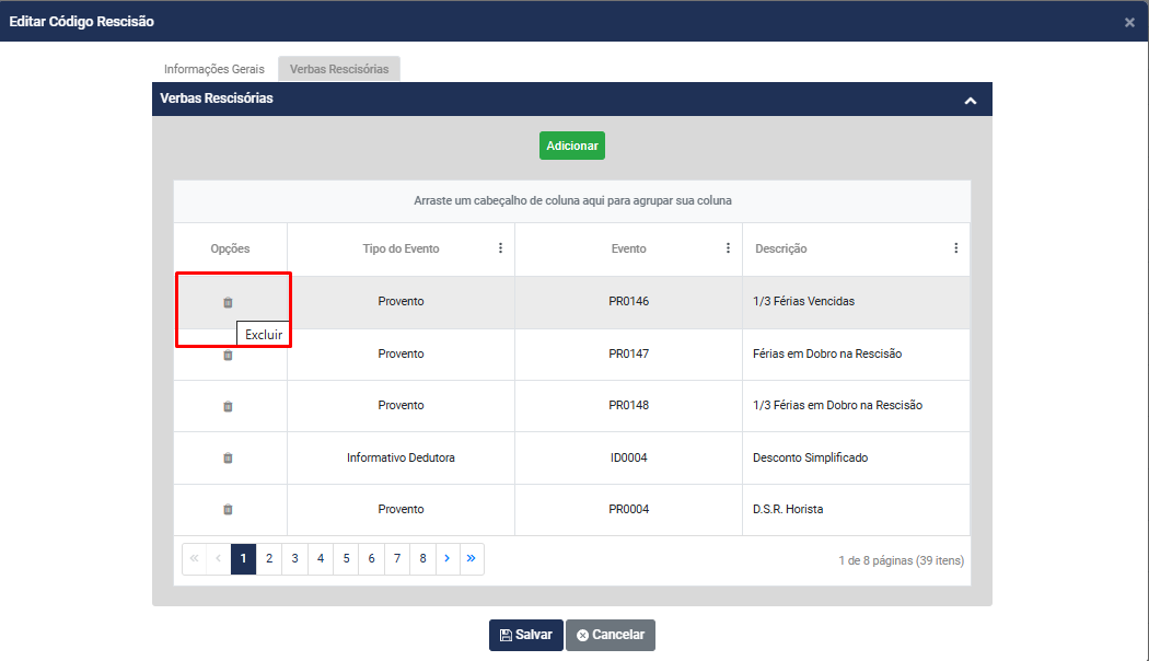 Será possível excluir verbas rescisórias da relação que está definida para os cálculo do Código de Rescisão definido anteriormente, para isso bastará que você acesse o botão "Excluir" Não será questionada a exclusão, ao clicar no botão o Módulo irá realizar a exclusão do evento.