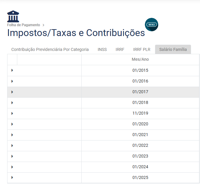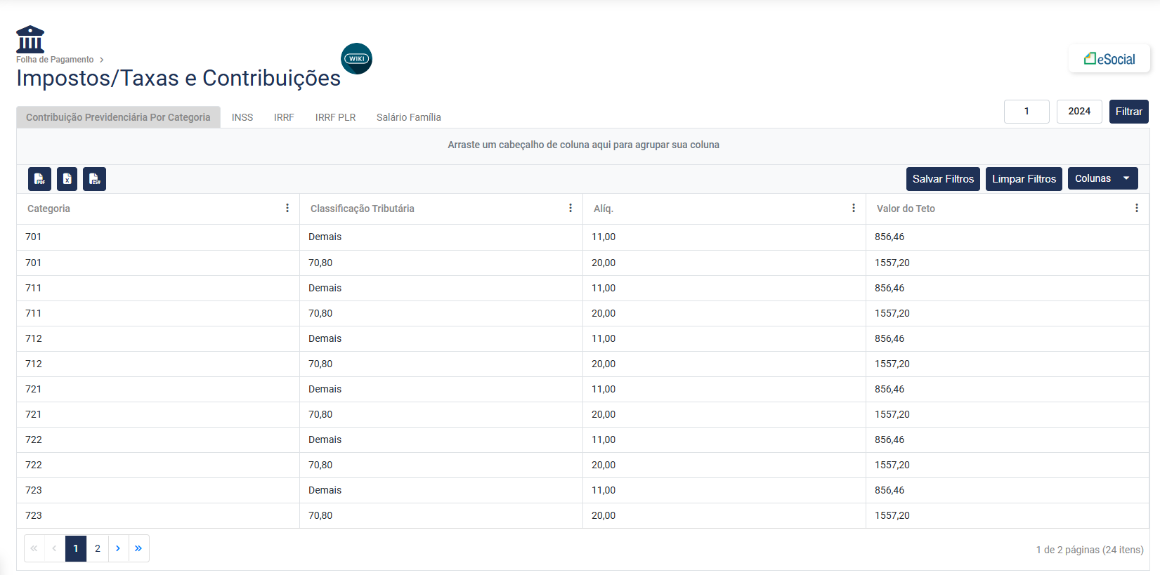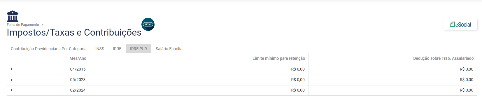 A tela apresentada trará uma aba para cada Imposto/Taxa e Contribuição (Contribuição Previdenciária Por Categoria, INSS, IRRF, IRRF PLR e Salário Família)