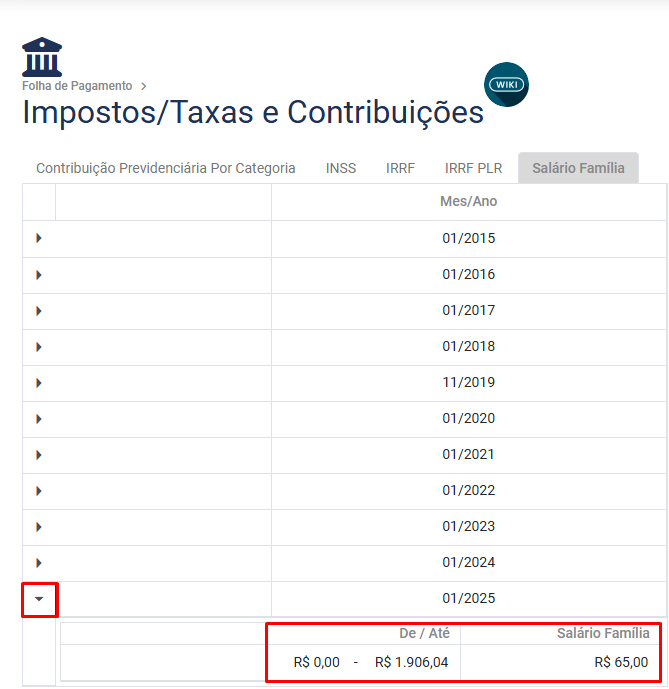 Expanda a informação da tabela que você precisa visualizar e o Módulo apresentará as faixas para cálculo dos valores de Desconto do INSS com as informações: