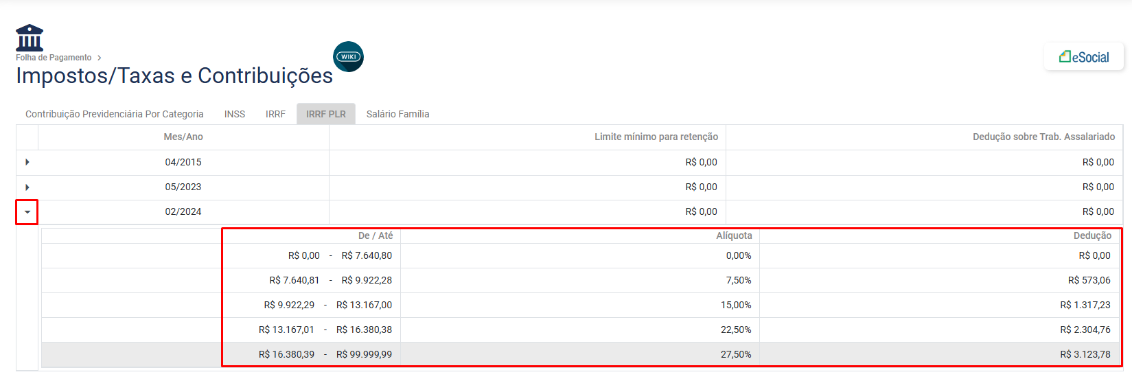 Expanda a informação da tabela que você precisa visualizar e o Módulo apresentará as faixas para cálculo dos valores de Desconto do IRRF PLR com as informações: