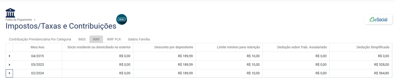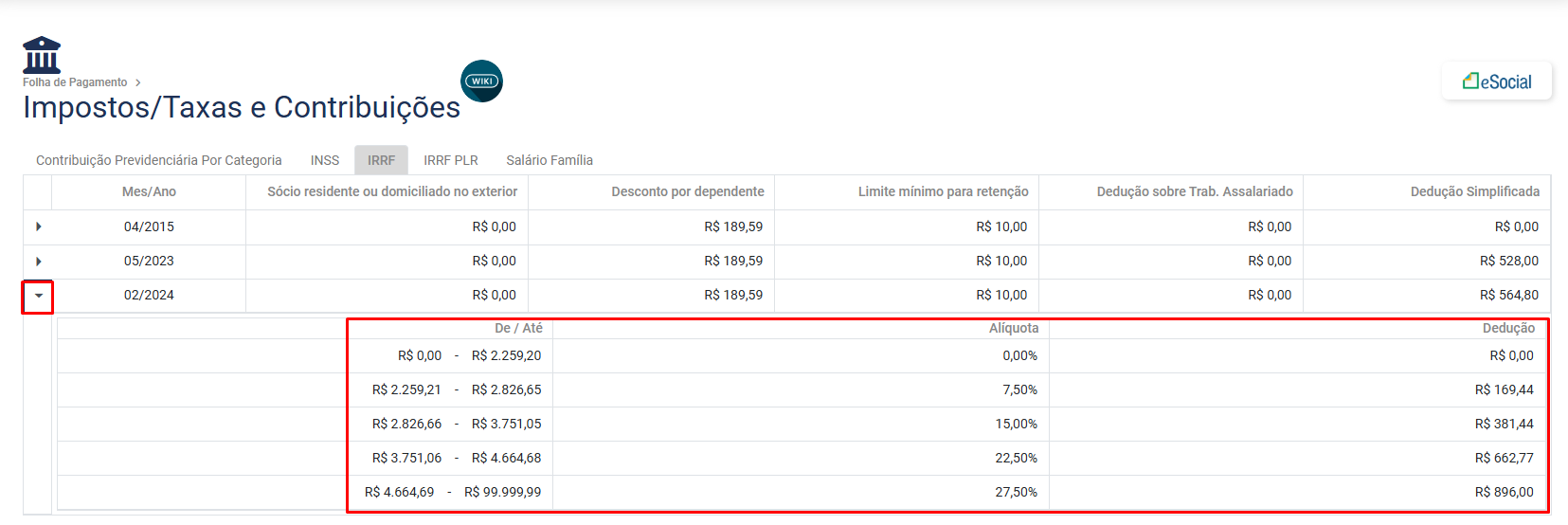 Expanda a informação da tabela que você precisa visualizar e o Módulo apresentará as faixas para cálculo dos valores de Desconto do IRRF com as informações: