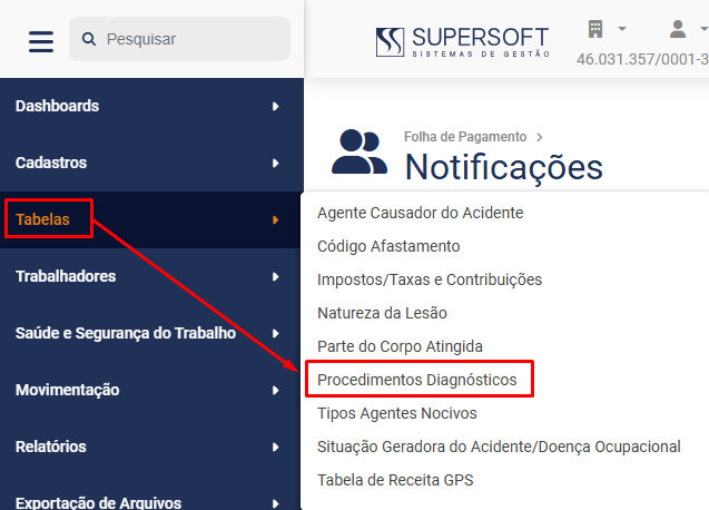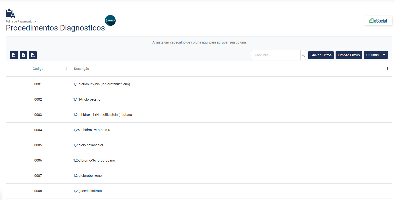 A tabela contendo os Procedimentos Diagnósticos já está cadastrada e pronta para utilização no Módulo, para visualizá-la acesse o menu Folha de Pagamento>Tabelas>Procedimentos Diagnósticos